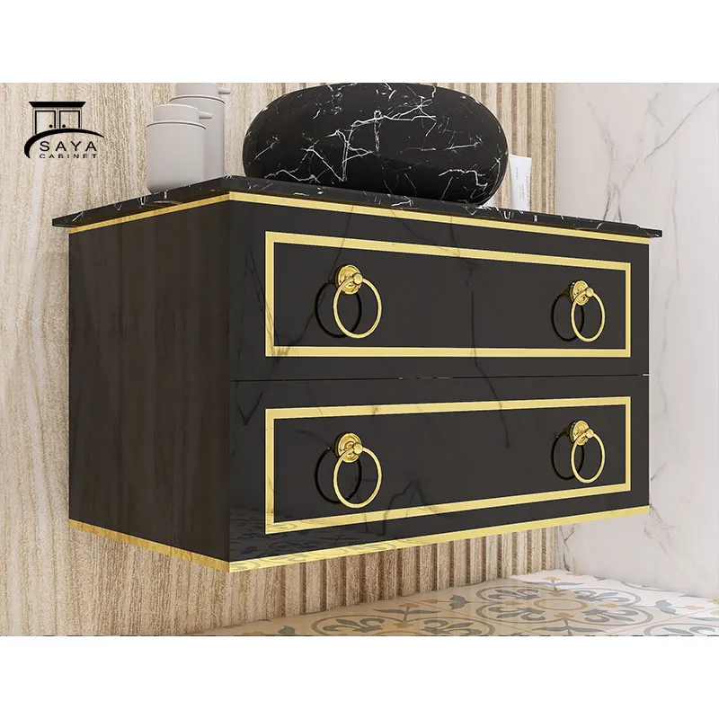 روشویی کابینتی مشکی دو کشو | ترکیب سنگ طبیعی با آینه و بدنه استیل